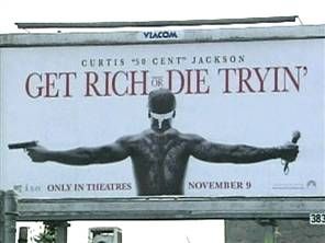 One version of the the billboards showed 50 Cent in a crucifixion pose with a gun in one hand and a microphone in the other. Despite the rapper’s claims that the image was only intended to communicate his struggle to escape street life, Paramount Pictures pulled some of the ads.