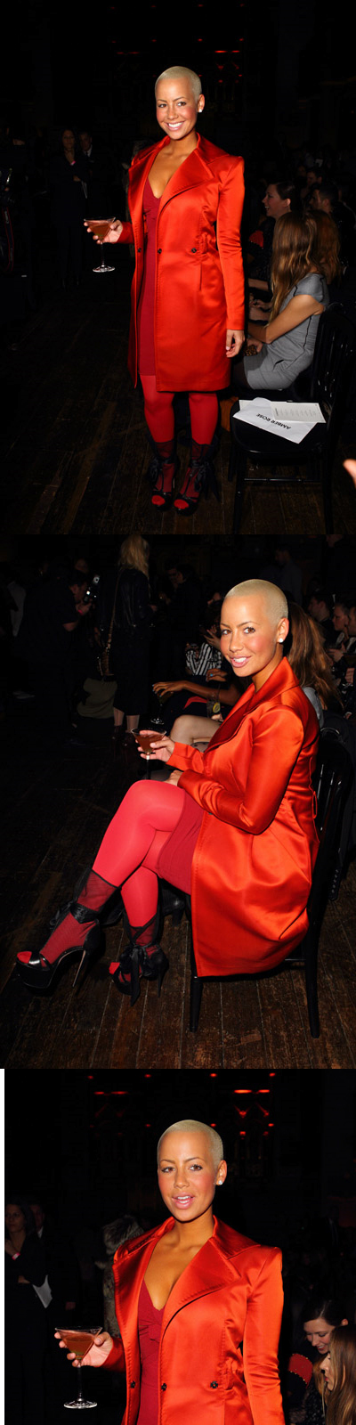 With the amount of front row fashion shows that Amber Rose has attended I think its safe to call her a stripper turned socialite. She skipped out on NYC fashion week this year but She managed to catch a flight out of LA after the NBA All Star game to sit front and center for the Julien Macdonald’s show last night, I`m not really feeling this outfit because I hate chicks that wear sandals and leggings or socks or whatever that is, and secondly it doesn’t show enough skin.