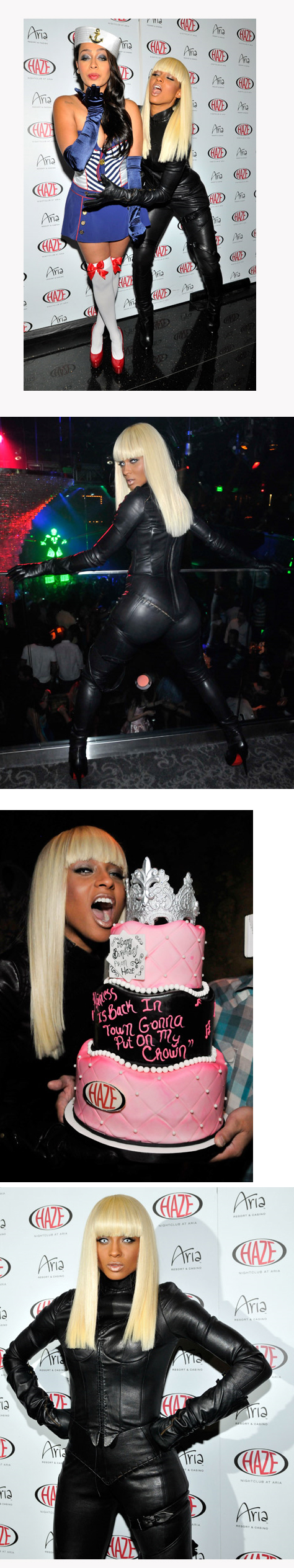 Ciara went all out last night for her 25th Birthday bash in Vegas. Although She rocked a blond wig, cat eyes and a black body suit for her portrayal of the X-Men character Storm something about her costume screamed Nicki Minaj. It just seems so minajish with the contacts, bangs and body suit combo that it gave me a glimpse of what Ciara would look like with the Minaj treatment. Being a sucker for blonds its a good look baby, peep the last pic for a good comparison of Nicki and Cici with the same look. Oh wonky eye LaLa was there as some kind of sailor or something.