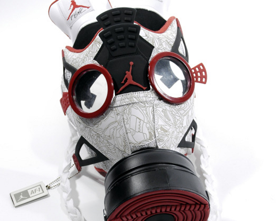 Art consortium ‘Freehand Profit‘ created the most bad-ass gas mask in history, using an Air Jordan IV Fusion Laser. The reason for it is supposed to be a political statement, not sure what it is, maybe the statement is you can still look dope in a nuclear holocaust?