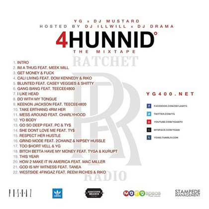 Compton rapper, YG brings his latest offering with DJ Mustard titled 4 Hunnid Degreez. The mixtape hosted by DJ Drama & DJ Ill Will includes plenty of features from fellow artists Meek Mill, Mac Miller, 2 Chainz, Casey Veggies, and more.